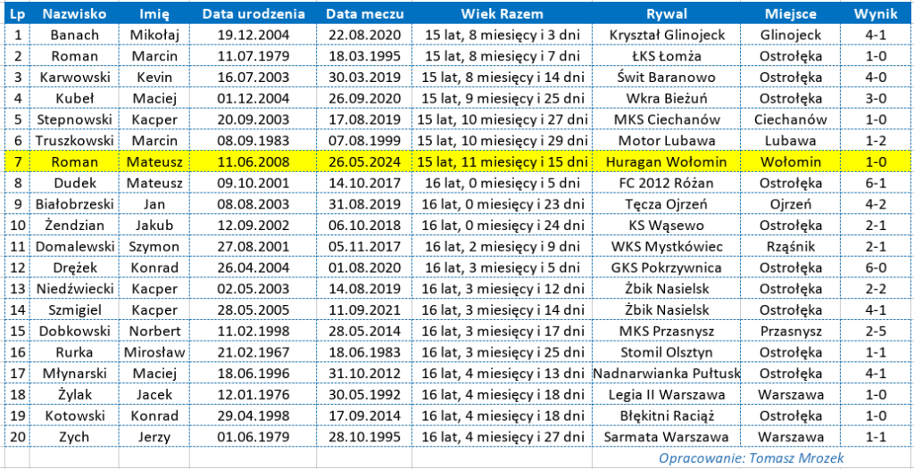 Wchodząc na boisko pod koniec meczu z Huraganem Wołomin, Mateusz Roman został jednym z najmłodszych debiutantów w historii Narwi. Mateusz miał tego dnia 15 lat, 11 miesięcy i 15 dni, co pozwoliło mu zająć siódme miejsce w naszej klasyfikacji wszech czasów.