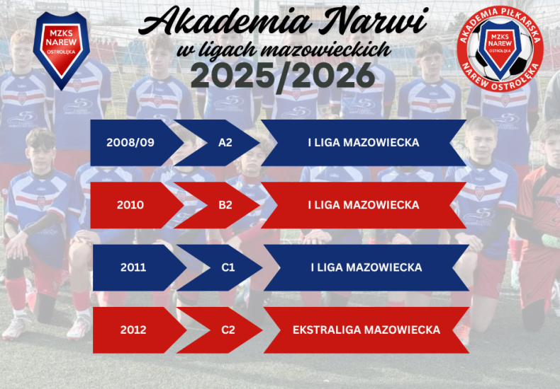 Jesienią sezonu 2025/26 w rozgrywkach młodzieżowych wystartuje aż jedenaście zespołów juniorskich Narwi Ostrołęka. Od rocznika 2008 do 2013, w którym utworzyliśmy nowe zespoły po naborze, głównie z APN Ostrołęka i Korony Ostrołęka. Kolejny sezon z rzędu we wszystkich rozgrywkach, w których możemy grać w ligach mazowieckich – gramy w nich.