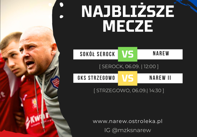W najbliższy weekend obie drużyny seniorskie Narwi zagrają na wyjazdach – jedynka w Serocku, a dwójka w Strzegowie.