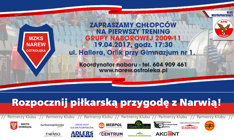 Ustalono już termin pierwszego treningu grupy naborowej Narwi, złożonej z chłopców urodzonych w latach 2009-2011. Odbędzie się on 19 kwietnia o godzinie 17:30 na Orliku przy Gimnazjum nr 1.