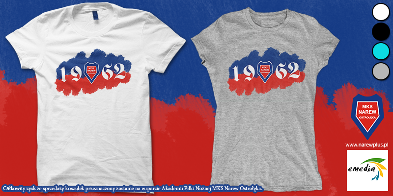 MKS Narew Ostrołęka wraz z firmą EMEDIA Tomasz Mrozek proponuje wszystkim Kibicom drużyny niebiesko-czerwonych nową akcję. Przedstawiamy koszulki „1962”. Za całkowity zysk z zakupu każdej sztuki tej koszulki zostanie zakupiony sprzęt dla zawodników Akademii Piłki Nożnej MKS Narew Ostrołęka (w zależności od ilości sprzedanych koszulek – np. piłki, torby lub stroje). Jednocześnie informujemy, że akcja trwać
