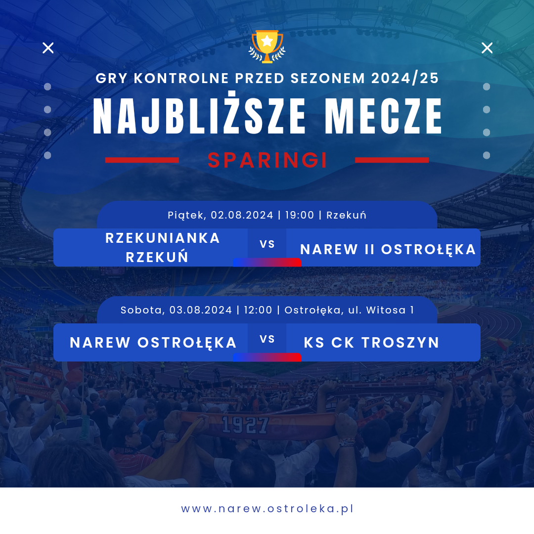 Swoje ostatnie mecze kontrolne rozegrają dwie drużyny seniorskiej Narwi. Okres przygotowawczy dla zespołu rezerw zakończy się już dziś – o godzinie 19:00 w Rzekuniu, gdzie zmierzymy się z tamtejszą Rzekunianką. Pierwszy zespół podejmie na własnym stadionie (ul. Witosa 1) KS CK Troszyn. Mecz rozpocznie się w samo południe, o godzinie 12:00. Liczymy na Waszą obecność